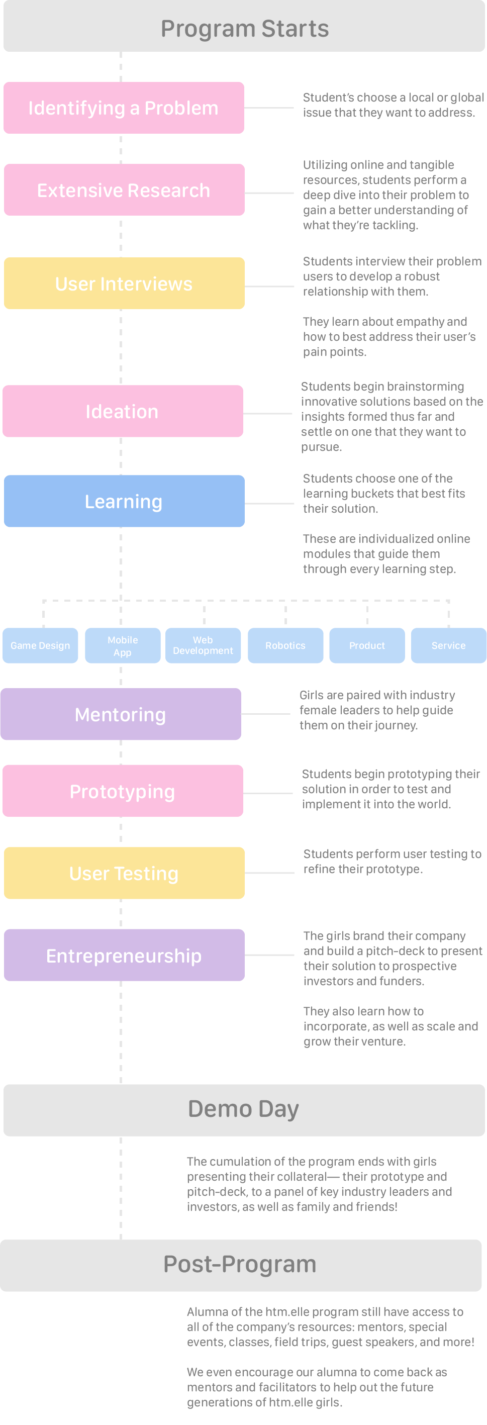 While the pilot program conducted in Summer of 2019 was effective, I found a gap in the shift between topics: design, engineering, and cognitive science. Instead of learning topics individually, I asked how we can extract the similarities of each topic to teach more holistically. Through the development of this idea, I created a new structure for the program that was based on the appropriate blend of information in a Design Thinking process.